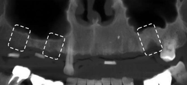 Fig. 4. Cone beam computed tomography image of patient A. The atrophy of maxillary alveolar process is noted (marked with rectangles)