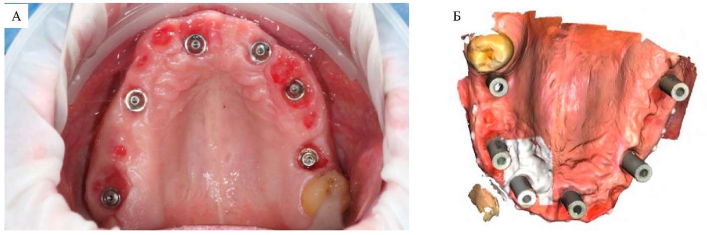 Рис. 14. Состояние мягких тканей полости рта пациент А. через 6 месяцев после операции (А). 3D-модель верхней челюсти через 6 месяцев после операции (сканирование с уровня скан-маркеров) (Б)