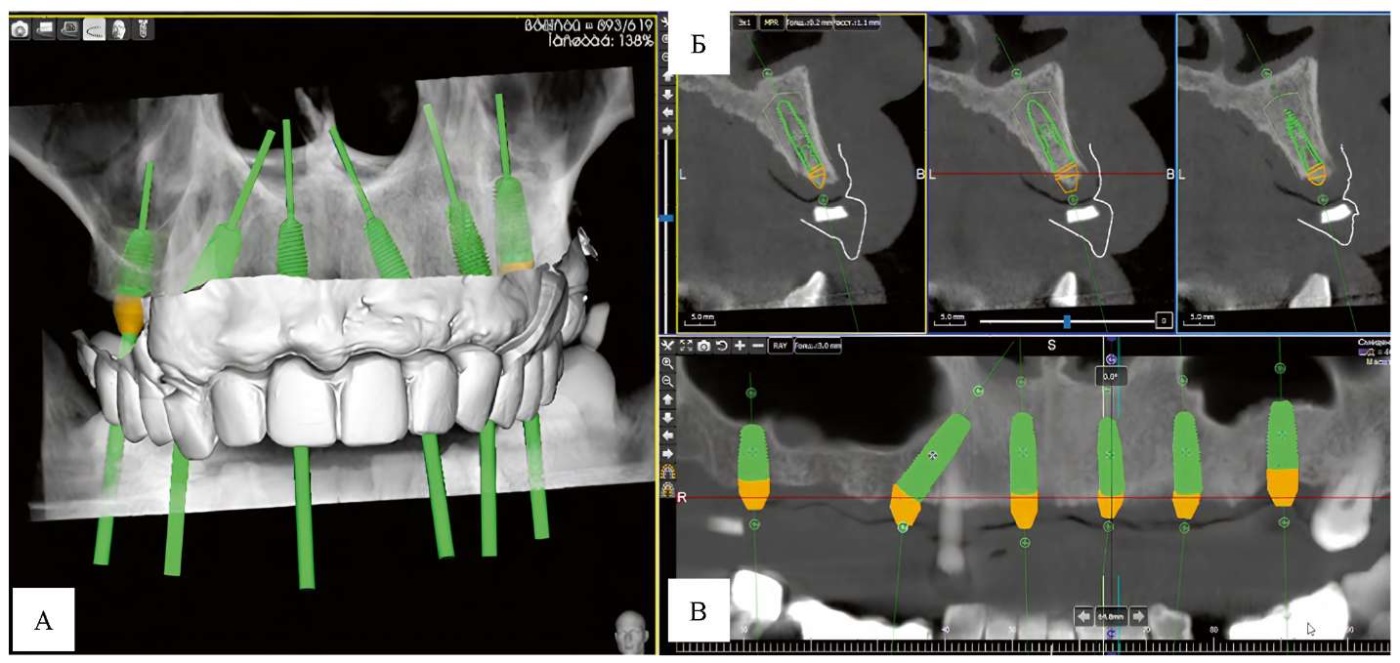 Fig. 5. Virtual planning of dental implant surgery for patient A. in the 3Diagnosys software: A — a model of artificial tooth crown on the patient’s partial removable denture was used as a reference point for implant positioning with superimposition on cone beam computed tomography images; Б — positioning of implants in the maxillary alveolar process in the simulation software on a sagittal section; В — virtual positioning of implants superimposed on an orthopantomogram