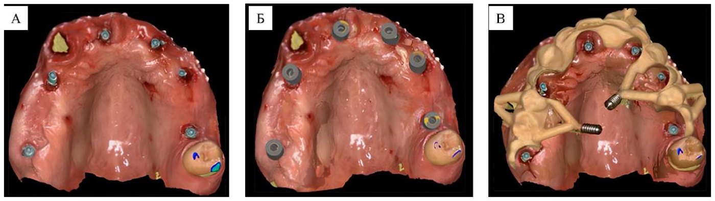 Fig. 9. Intraoral scanning of patient A. on the day of surgery: A — without scan markers; Б — with scan markers; В — with occlusal template