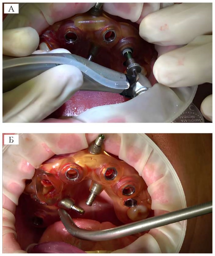 Рис. 7. Этап установки дентальных имплантатов у пациента А: А — до удаления зуба 1.3; Б — после удаления зуба 1.3