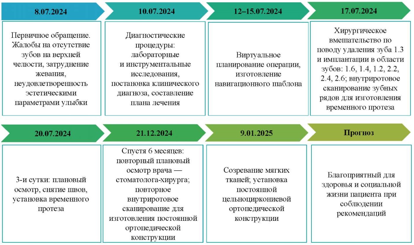 В соответствии с поставленным диагнозом был составлен план лечения, который включал в себя: удаление зуба 1.3; установка 6 имплантатов системы Neodent (Straumann, Швейцария) в области зубов 1.6, 1.4, 1.2, 2.2, 2.4, 2.6 с одномоментной установкой супраструктур (мультиюнит-абатменты); интраоперационное сканирование с уровня мультиюнит-абатментов с последующим изготовлением временной конструкции на винтовой фиксации из PMMA-пластмассы (Polymethyl Methacrylate, полиметилметакрилат); через 6 месяцев после проведения операции — окончательное протезирование.