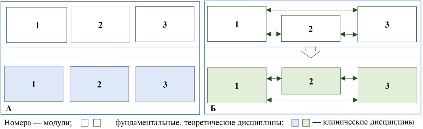 Рис. Схема традиционной (А) и интегративной (Б) моделей образовательного модуля, используемых при постдипломном повышении квалификации