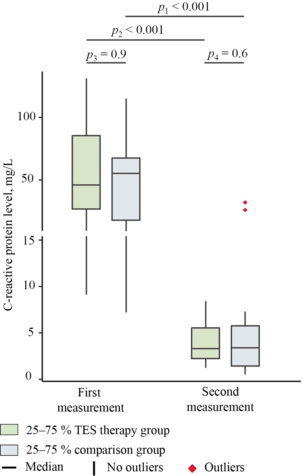 In the comparison group, the CRP level (Fig. 3) was equal to 55.2 (17.9; 67.6) mg/L prior to treatment, whereas in the group receiving transcranial electrical stimulation, it reached 46.1 (26.7; 85.5) mg/L. At baseline, intergroup differences were statistically insignificant (p = 0.9; effect size — PS = 0.5; 95% CI 0.288–0.719). Thus, both groups of patients exhibited a markedly elevated CRP level against the standard reference range of 0–5 mg/L6. Such hypersynthesis of acute phase proteins is characteristic of COVID-19 and is widely used as an indicator of inflammation severity and the need for therapy adjustment and prognosis [21].