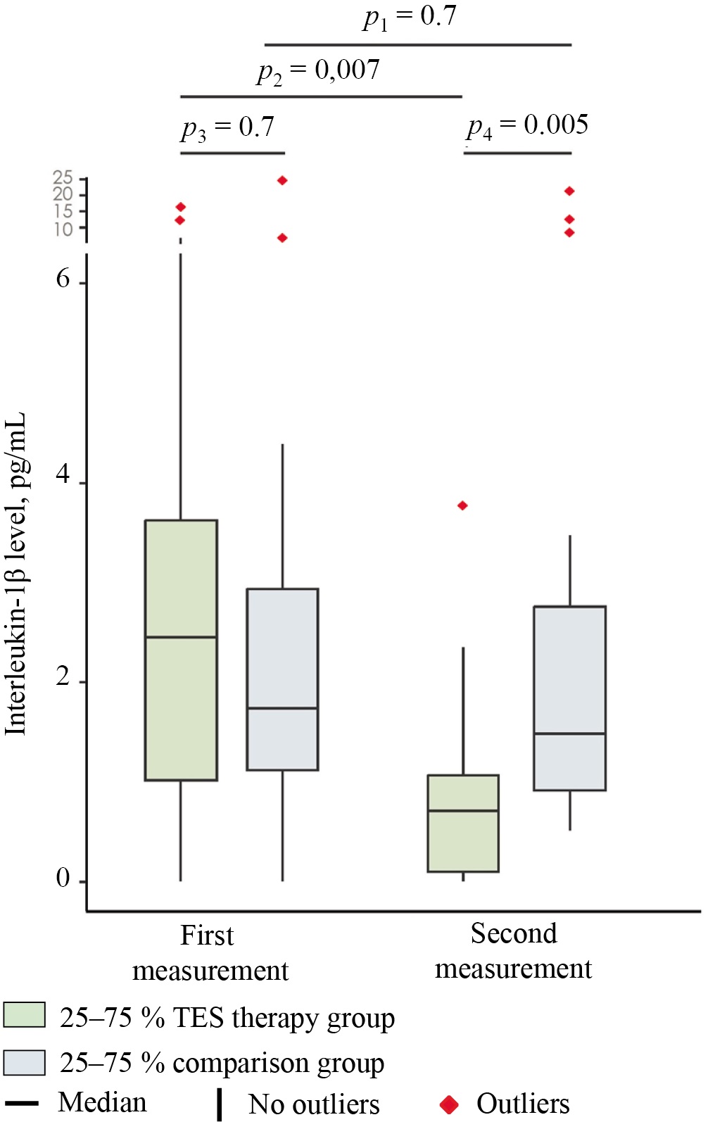 In the group receiving transcranial electrical stimulation, conversely, the IL-1β level reached 0.7 (0.1; 1.1) pg/mL by the time of the second measurement (Fig. 2), i.e., it decreased by 70.8% relative to the baseline (2.4 (1.0; 3.7) pg/mL) (p = 0.007; effect size — rc = 0.8 (95% CI 0.4–1)). By the end of the observation period, the TES therapy group exhibited a 53.3% lower level of the analyzed indicator (1.5 (0.9; 2.8) pg/mL in the comparison group versus 0.7 (0.1; 1.1) pg/mL in TES therapy group) (p = 0.005; effect size — PS = 0.2 (95% CI 0.06–0.4)).