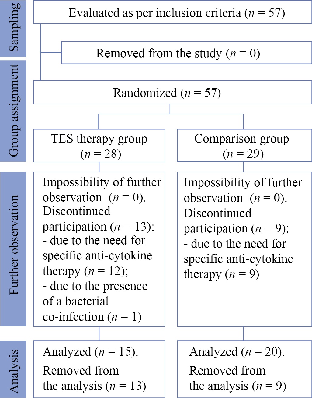 Between June 24, 2021 and February 23, 2022, 57 patients were invited to participate in the study. They were randomly divided into two study groups: the TES therapy group (n = 28) receiving transcranial electrical stimulation in addition to the standard treatment and the comparison group (n = 29) receiving the standard treatment. As a result of daily monitoring, thirteen people from the TES therapy group were removed from the study (of these, twelve patients required anti-cytokine therapy, and one was removed due to the presence of a bacterial co-infection), as well as nine people from the comparison group (due to the need for anti-cytokine therapy). Thus, the final analysis of the data was performed for 15 patients in the TES therapy group and 20 patients in the comparison group (see block diagram of the study design, Fig. 1).