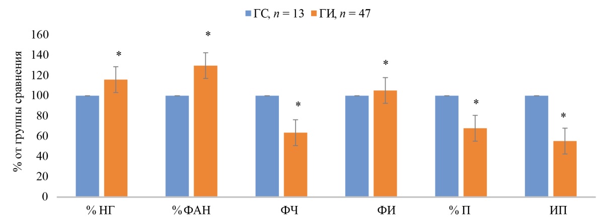 Обработка данных проводилась с использованием Microsoft Excel 2019 и онлайн-калькулятора (medstatistic.ru). Нормальность распределения проверяли критерием Шапиро — Уилка. Для сравнения независимых групп (ГС, ГИ1, ГИ2) применяли U-критерий Манна — Уитни, для сравнения связанных выборок (до/после лечения) — критерий Вилкоксона. Для контроля над риском ошибки I рода при множественных сравнениях иммунологических показателей использована поправка Холма — Бонферрони. Уровень значимости после коррекции установлен как p < 0,05. Клинические данные представлены как M ± SD, сравнение групп ГИ1 и ГИ2 проводили с помощью t-критерия Стьюдента. Размер выборки предварительно не рассчитывался ввиду пилотного характера исследования.